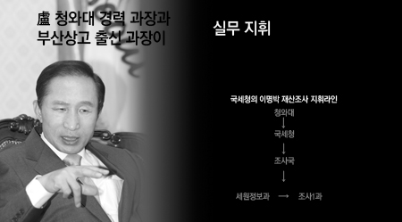 지난 대선 기간에 이명박 후보와 친인척 11명의 재산 상태를 포함한 개인정보를 광범위하게 수집·조사한 것으로 드러나 파문을 일으켰던 국세청의 ‘이명박 재산 내사’는 노무현 청와대의 민정수석실에 파견 근무했던 간부와 부산상고 출신 간부가 지휘한 것으로 드러났다.