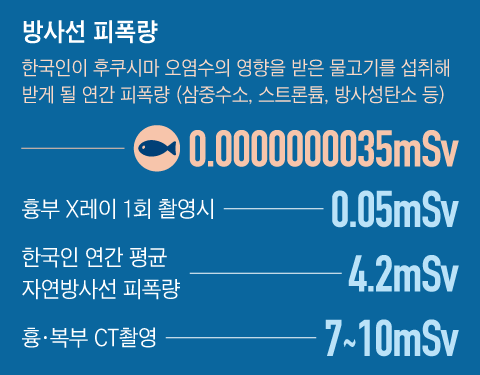 “한국원자력연구원 연구팀이 문재인 정부 시절이던 2020년 8월 작성한 보고서는 ‘한국인이 후쿠시마 원전 오염처리수의 영향을 받은 물고기를 섭취해 받게될 연간 방사능 피폭량은 0.0000000035mSv으로 흉부(胸部) X레이를 한 차례 찍을 때의 피폭량인 0.05mSv과 비교하면 1000만분의 1 정도’라고 밝혔다. 최근 어떤 연구소는 그 비율이 10만분의 1이라고 했고, 또 다른 곳은 1조(兆)분의 1이라고도 했다. 어느 쪽이든 국민 건강에 거의 무해(無害)하다는 게 과학자들의 일치된 연구 결론이다.”